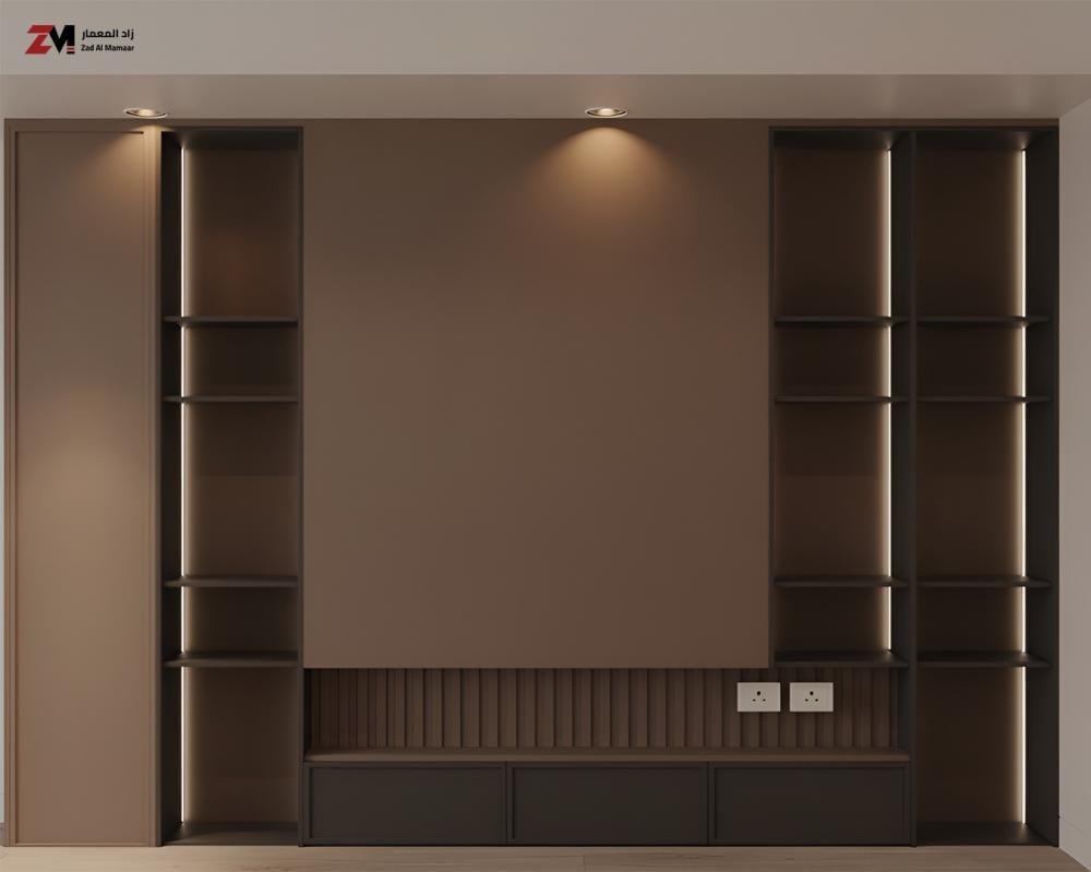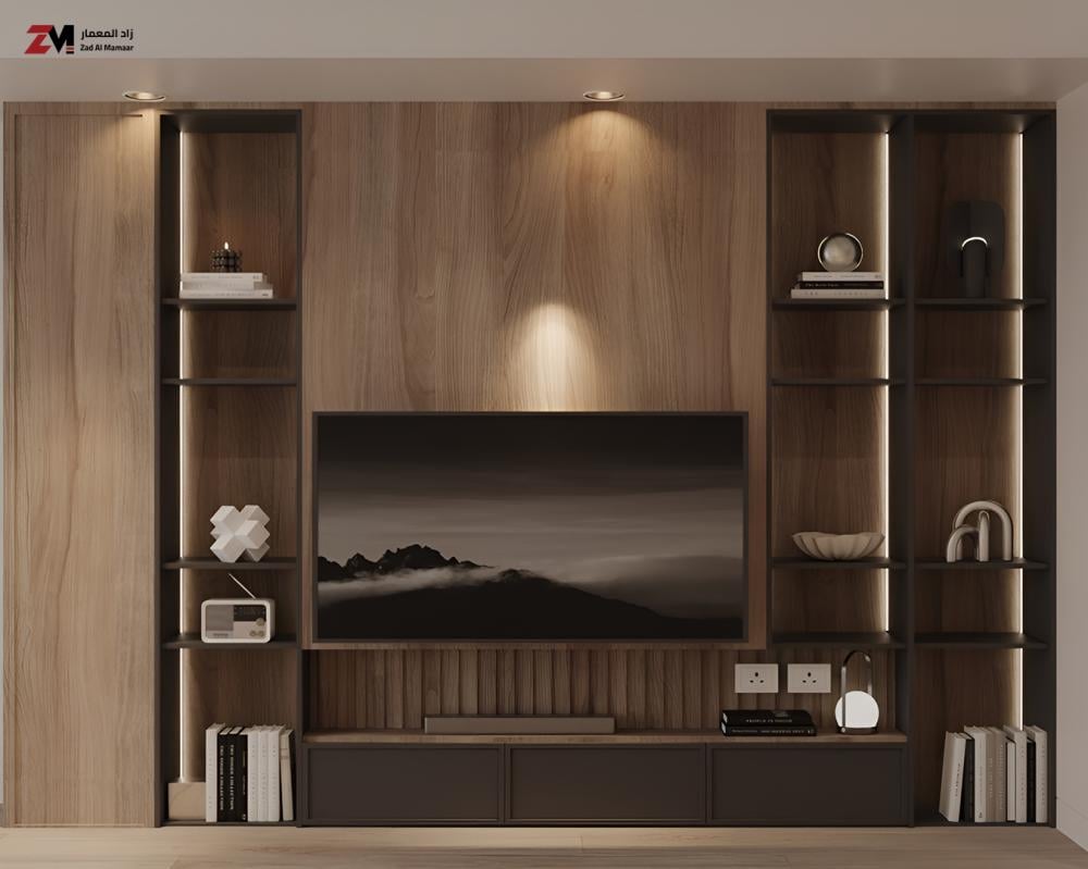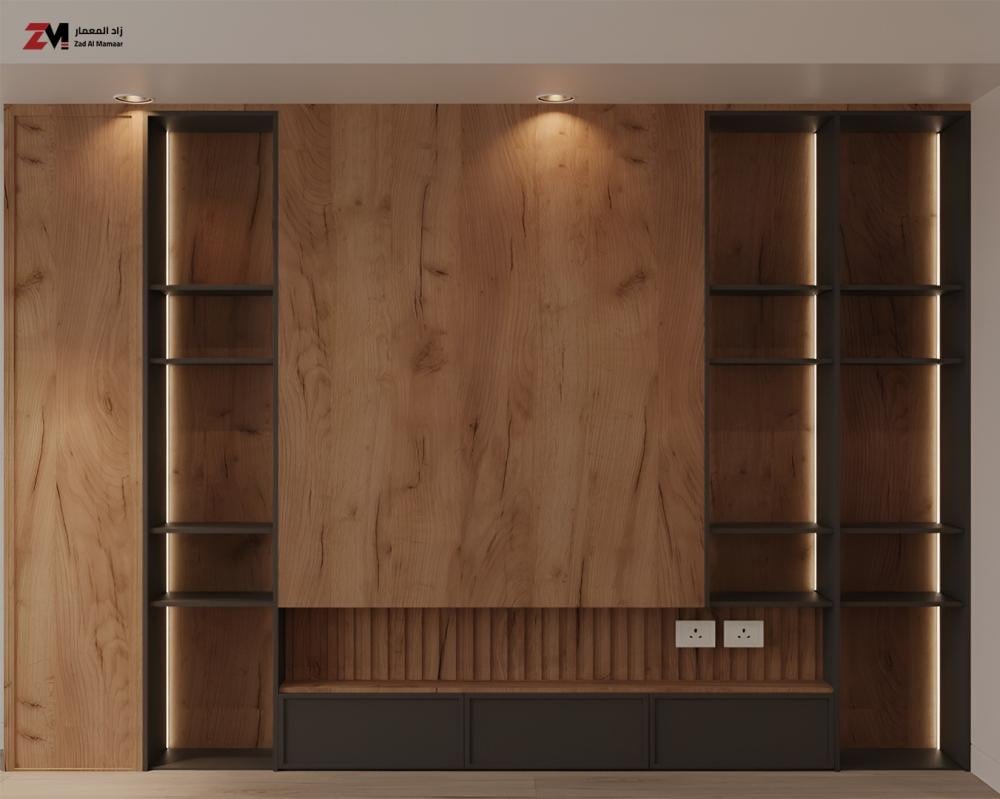 أضف لمسة من الفخامة والدفء إلى غرفة معيشتك مع ديكورات تلفاز بالخشب المميزة من متجر زاد المعمار للاثاث المنزلي. تتميز الوحدة بتصميم عصري وخلفية جدارية مكسوة بالخشب الطبيعي، مما يضفي أجواءً راقية ودافئة على المساحة. مع أرفف جانبية مثالية للتنظيم والعرض وإضاءة مدمجة تضيف لمسة جمالية فاخرة، هذه الوحدة تجمع بين الجمال والعملية.